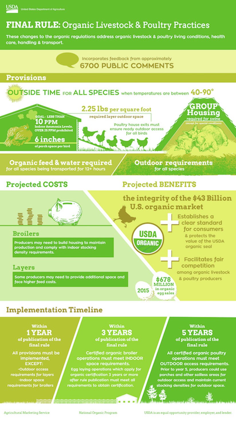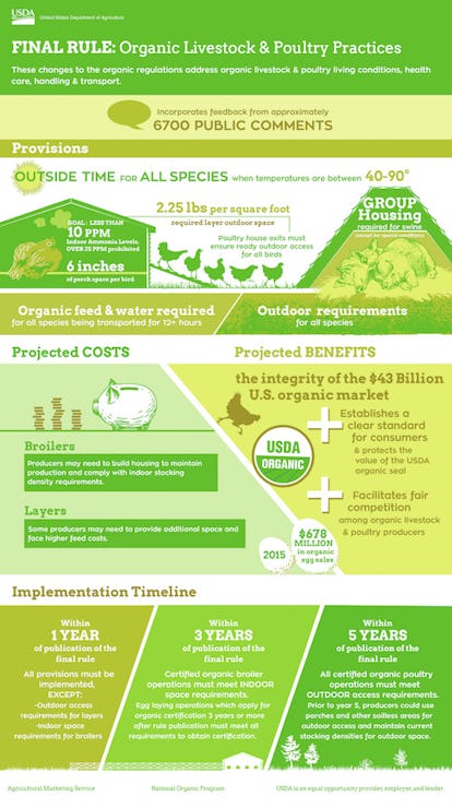 Damit ein Tier als biologisch gilt, regelt das USDA mehrere Standards. Neben dem Verzehr von Bio-Futter und der Freiheit von Hormonspritzen muss ein Bio-Tier Zeit im Freien verbringen und genügend Platz haben, um das zu leben, was das USDA als bequem definiert.